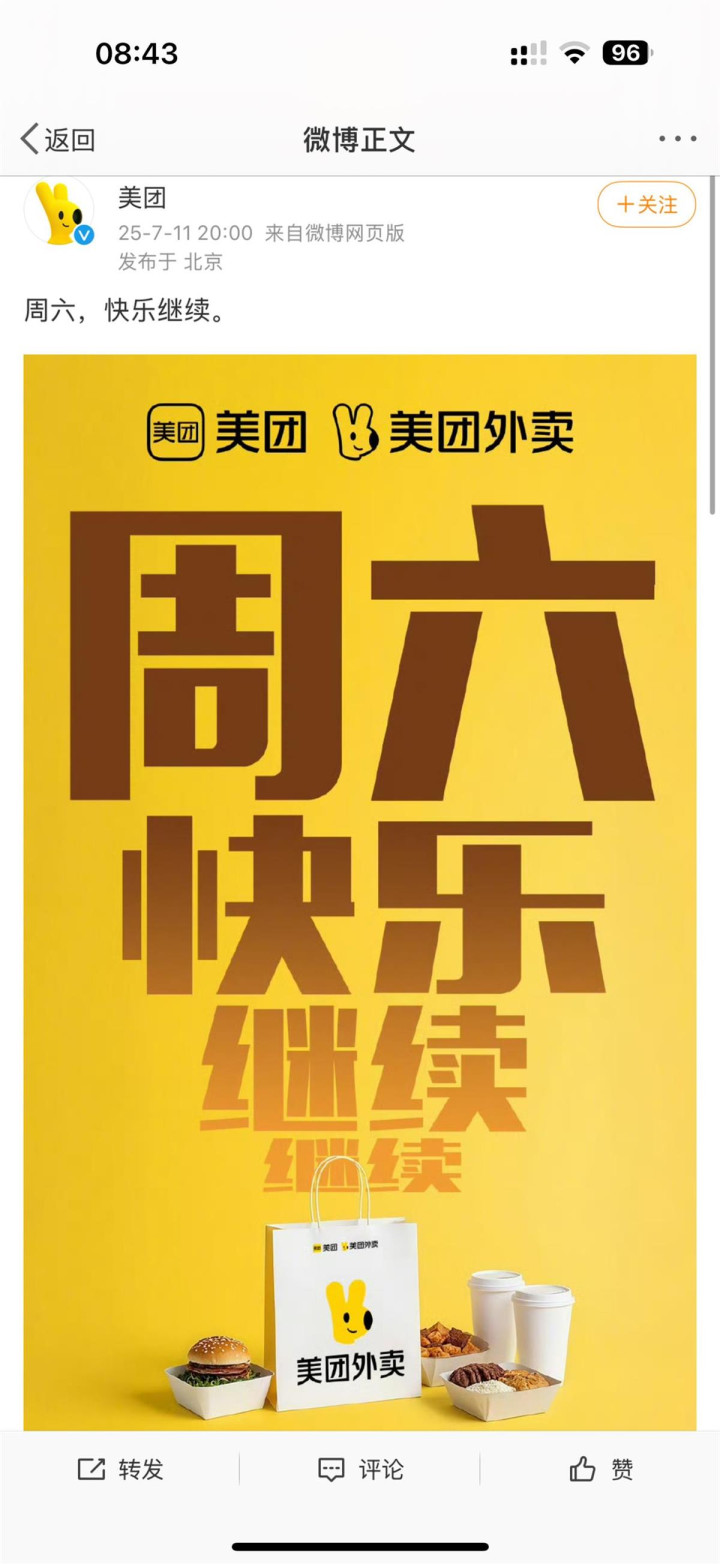 极目新闻记者注意到,7月11日晚,美团官方就发布了“周六,快乐继续”的微博,预告本周末的外卖狂欢。7月12日一早,淘宝闪购官方也在微博宣布“周六吃点好的,‘超级星期六’188元大券包,五顿我全包”。